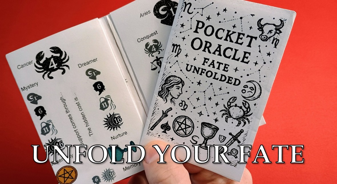 This pocket oracle is inspired by tarot and the zodiac, condensed into a single folded sheet. Each reading reveals prompts, word-pairs, and suit patterns that invite reflection, story, and insight.